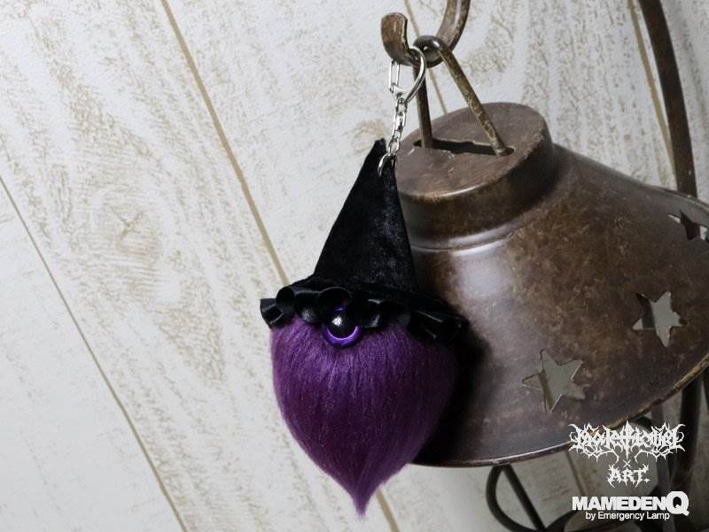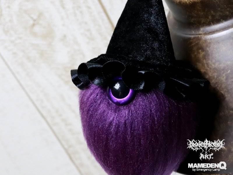 毛色と目玉をパープルに統一したボディに魔女の帽子を被せました。